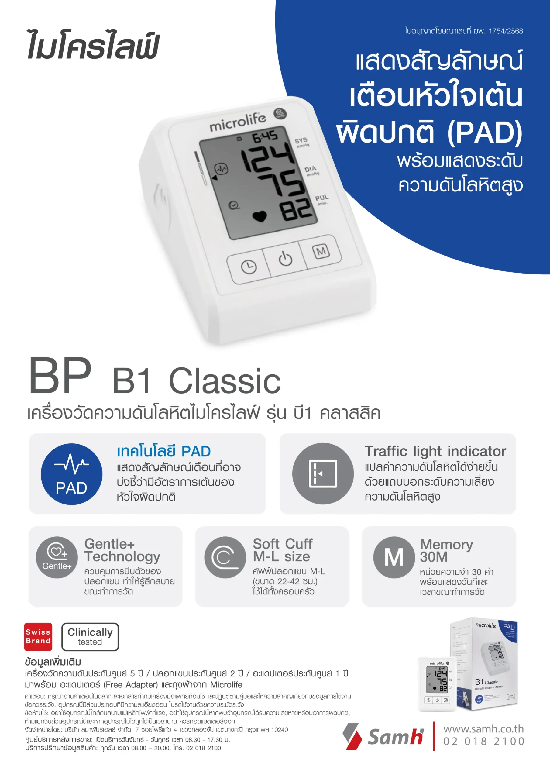 เครื่องวัดความดันไมโครไลฟ์ รุ่น B1 คลาสสิค มาพร้อมกับเทคโนโลยี PAD ตรวจจับชีพจรพร้อมกับตรวจวัดการเต้นของหัวใจผิดปกติ และผ่านการทดสอบทางการแพทย์ในระดับสากล ได้แก่ ESH, BHS, และ AAMI